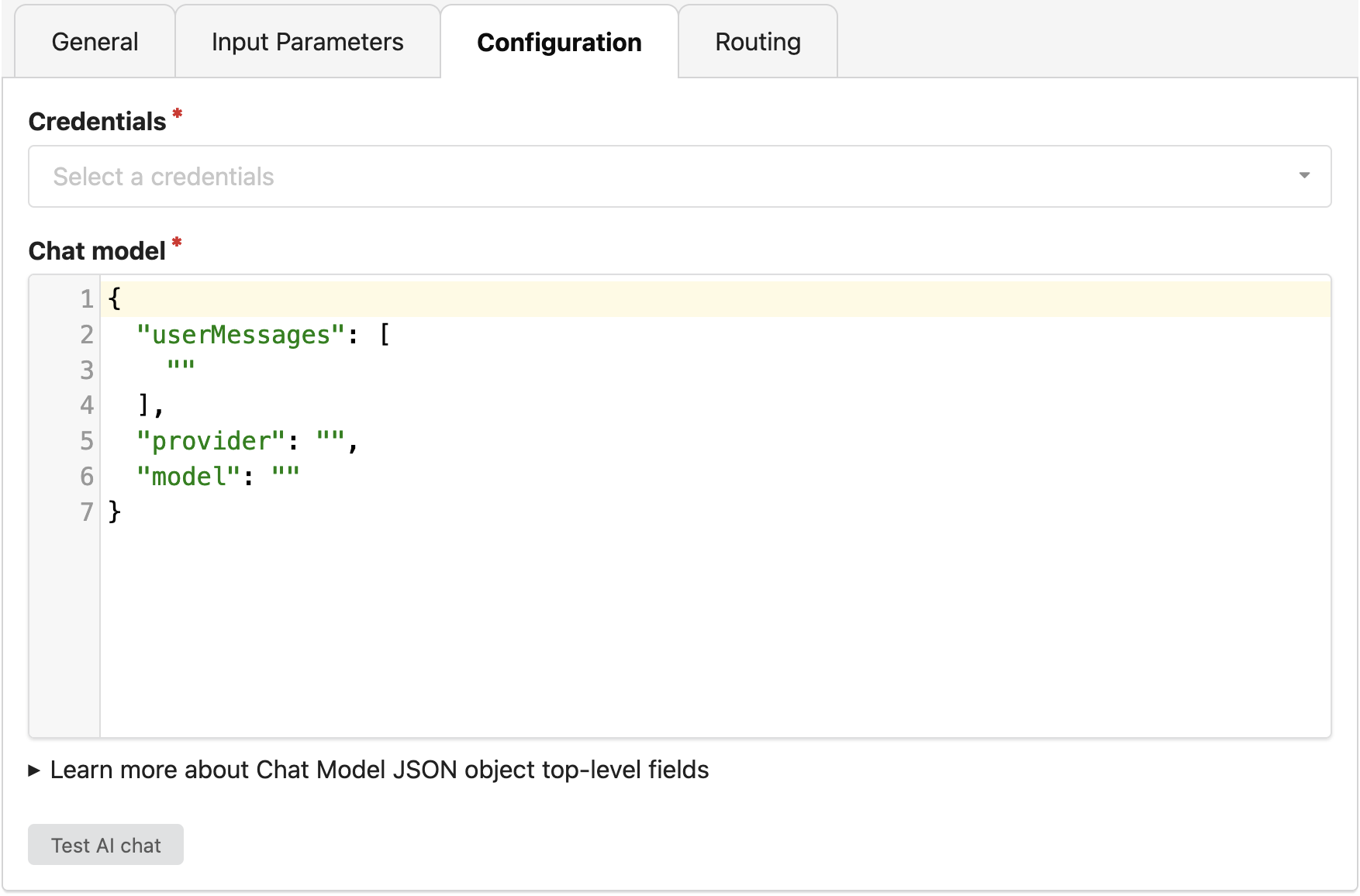 The Test AI chat button allows you to test the AI Chat model configuration with the task input parameters JSON data.